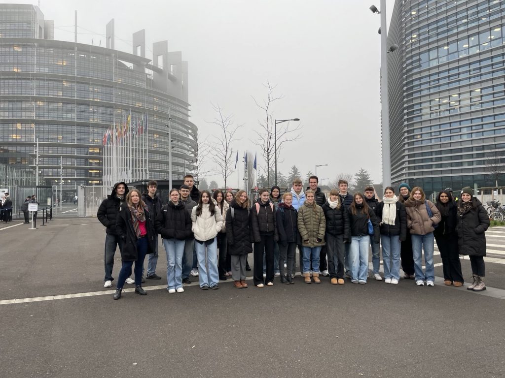 Am Dienstag, 16. Dezember 2025 überquerten wir mit allen Schülerinnen und Schülern der Französischkurse wieder – wie im vergangenen Jahr – den Grenzfluss Rhein, um ins benachbarte Elsass nach Straßburg zu fahren. Davor hatten wir einige Stunden auf der Straße verbracht, da uns unser Busfahrer bereits bei der Abfahrt mitteilen musste, dass wegen eines Unfalls die Autobahn teilgesperrt wurde. Also gelangten wir über Umwege und lange Staus zum Europaparlament, durchliefen die Sicherheitskontrollen mehr oder weniger im Laufschritt, um mit nur fünfminutiger Verspätung (!) im Sitzungssaal Platz zu nehmen. Der Abgeordnete des EU-Parlaments Michael Bloss (Fraktion der Grünen / Freie Europäische Allianz) erwartete uns bereits und berichtete kurz von seinem Werdegang und seinem Antrieb, sich für europäische Politik stark zu machen. Er sagte, für ihn sei es ein großes Privileg in Stuttgart bzw. in Europa aufgewachsen zu sein. Hier ginge es den Menschen größtenteils gut, im Vergleich zu anderen Regionen dieser Welt, wo insbesondere junge Menschen kaum Rechte und wenig Perspektiven hätten. Im nächsten Schritt leitete er über zur aktuellen Debatte im Parlament, die am Nachmittag stattfinden sollte: das mögliche Verbrenner-Aus in Europa. Mit den Worten „Debate me!“ ermunterte er die Schülerinnen und Schüler ihm Contra zu geben, was diese auch gerne annahmen. Er stand unseren Schülerinnen und Schülern Rede und Antwort, bevor er schließlich zu einem Interview mit der Tagesschau eilte.